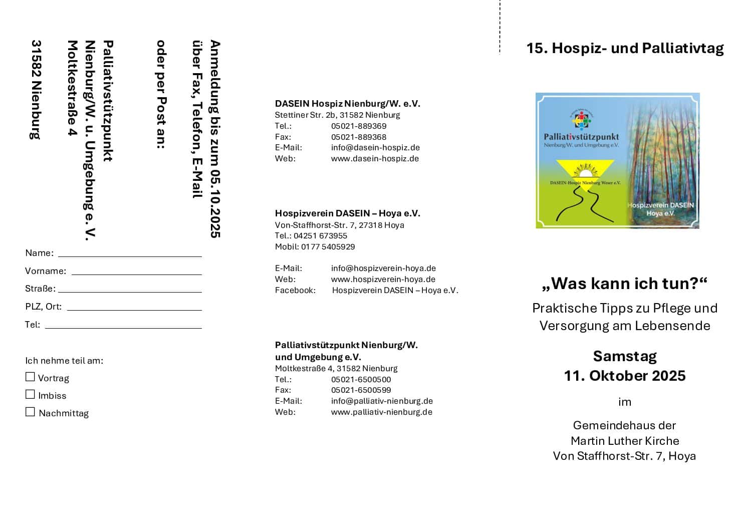 Am Samstag, den 12 Oktober 2024 von 10:30 Uhr bis 16 Uhr laden der Hospizverein DASEIN Nienburg/W. e.V., der Palliativstützpunkt Nienburg/W. und wir ein zum 14. Hospiz- und Palliativtag in den Pavillon des DKR-Altenheimes Nienburg.